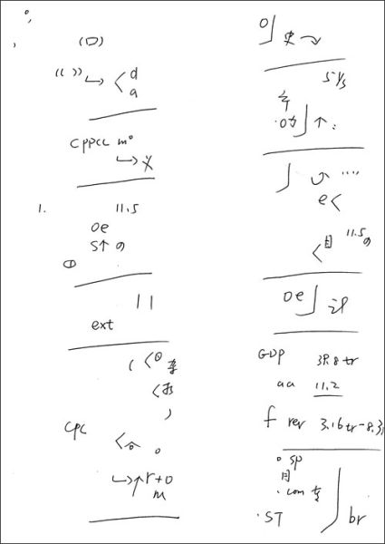 2011年温总理做政府工作报告,这里是一份报告内容的速记符号图,大家可以看一下,专业口译员是如何进行速记的,会用到哪些符号和缩略词。大家不妨先看着文本自己做笔记,然后再跟图对照一下吧。