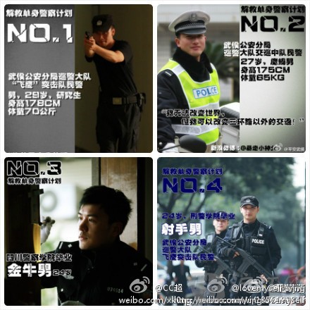 一号:千呼万唤以后,NO.1号单身警察火热出炉了!武侯公安分军巡警大队“飞鹰”突击民警。解救宣言:你的黑夜我的眼,因为黑夜才是我的工作舞台!