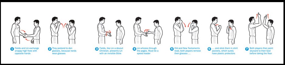 Jeremy Lin, a Harvard grad, and Knicks teammate Landry Fields, a Stanford man, geek out before games with a handshake ritual.