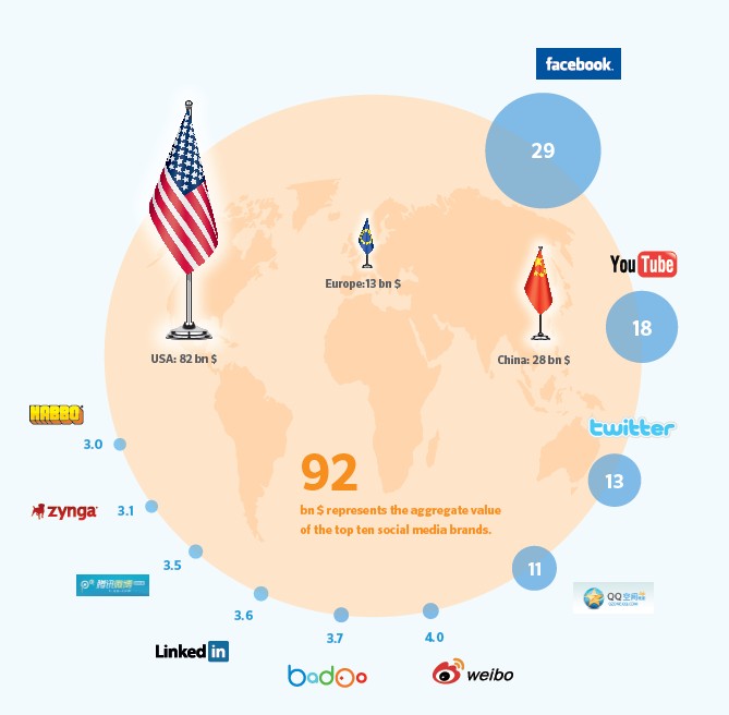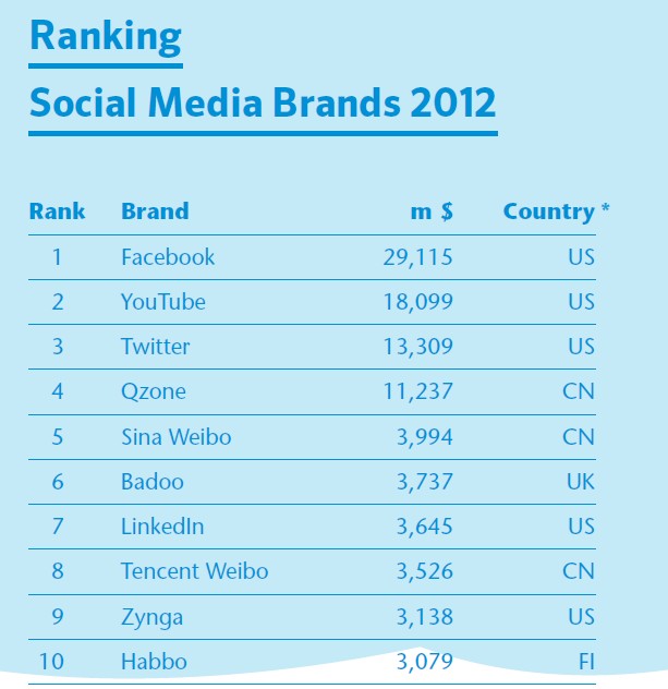 In addition to the many brands from the USA, there are also some "exotic" social media brands emerging in the ranking, such as the Chinese platform Qzone in fourth position Sina Weibo in fifth position and the two Facebook imitations VKontakte from Russia and Renren from China at positions 11 and 12. These and other social media brands in China and Russia have benefited from a strong increase in the number of Internet users and from the exponentially increasing diffusion rate of the platforms.